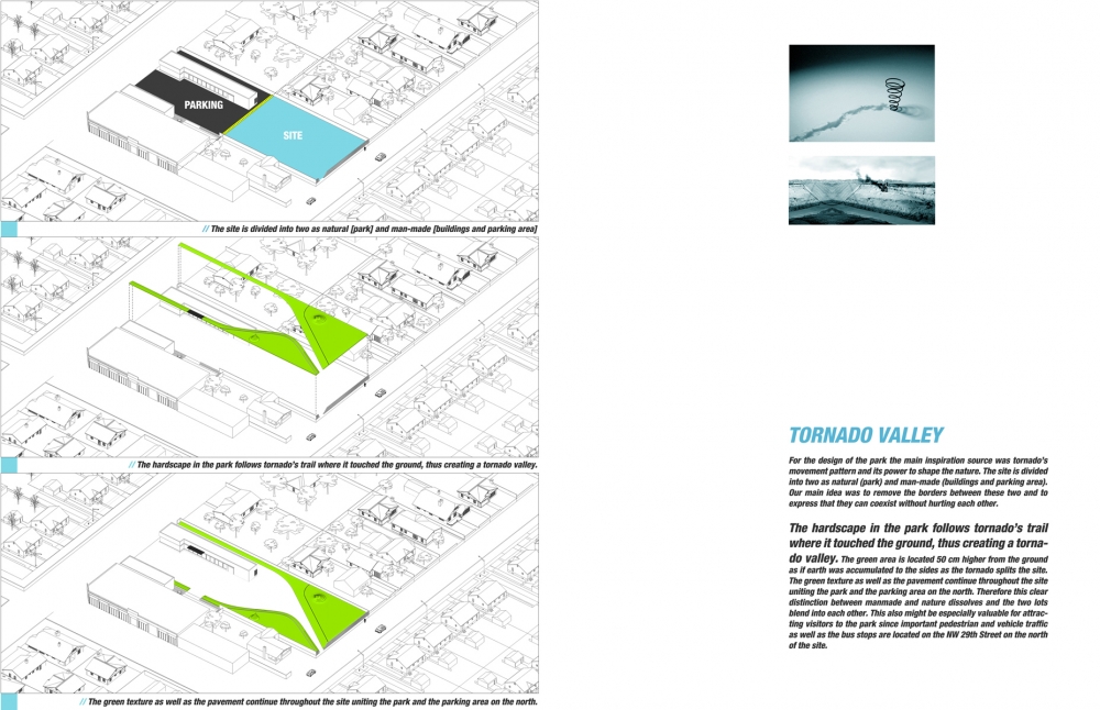 The hardscape in the park follows tornado’s trail where it touched the ground, thus creating a tornado valley. The green area is located 50 cm higher from the ground as if earth was accumulated to the sides as the tornado splits the site. The green texture as well as the pavement continues throughout the site uniting the park and the parking area on the north. Therefore this clear distinction between manmade and nature dissolves and the two lots blend into each other. This also might be especially valuable for attracting visitors to the park since important pedestrian and vehicle traffic as well as the bus stops are located on the NW 29th Street on the north of the site.