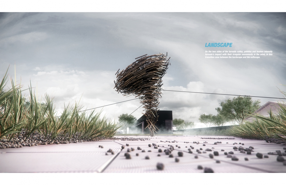 On the two sides of the tornado valley, pebbles and bushes intensify tornado’s impact with their irregular movements in the wind, in this transition zone between the hardscape and the softscape.