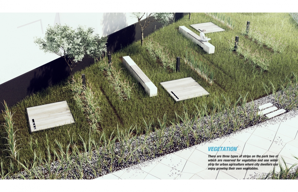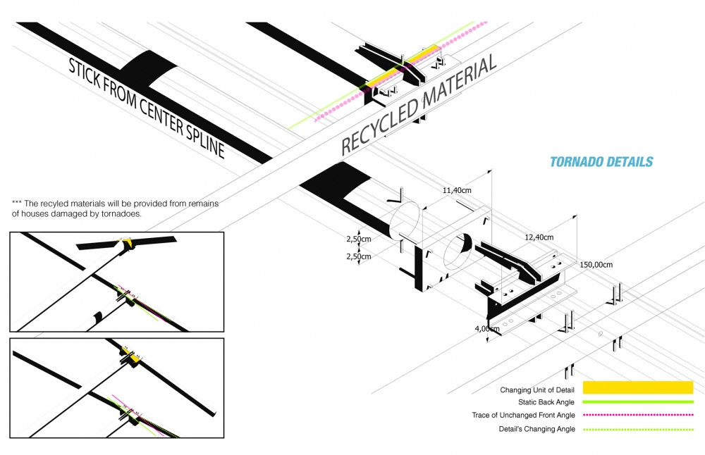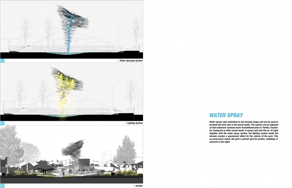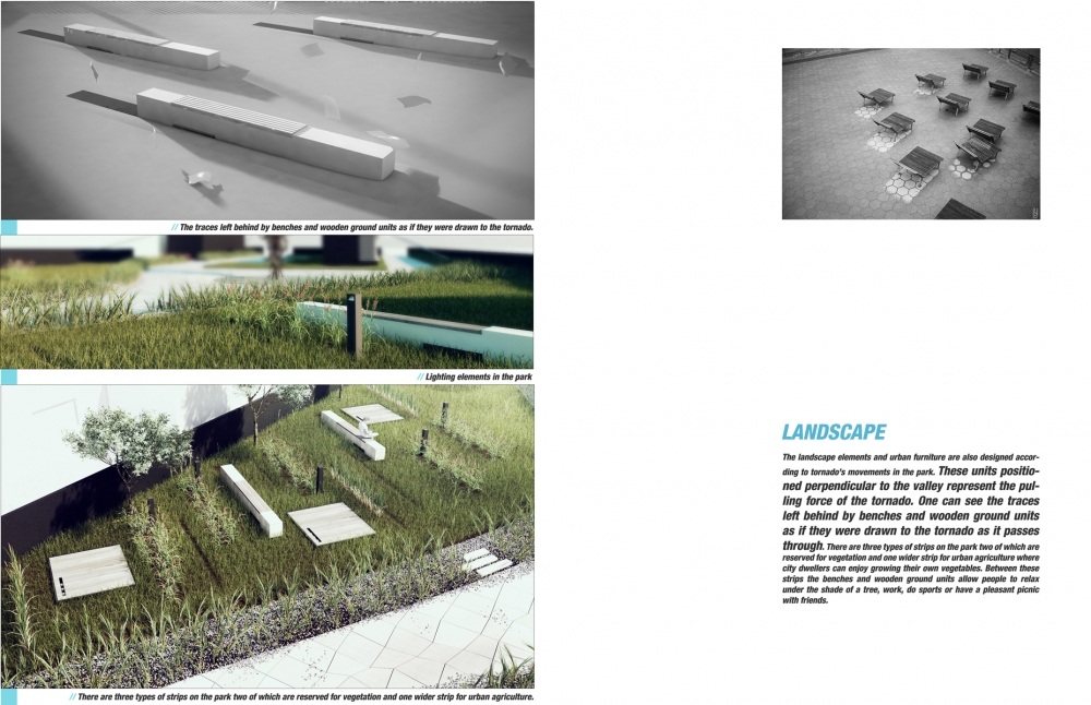 For the design of the park the main inspiration source was tornado’s movement pattern and its power to shape the nature. The site is divided into two as natural (park) and man-made (buildings and parking area). Our main idea was to remove the borders between these two and to express that they can coexist without hurting each other.