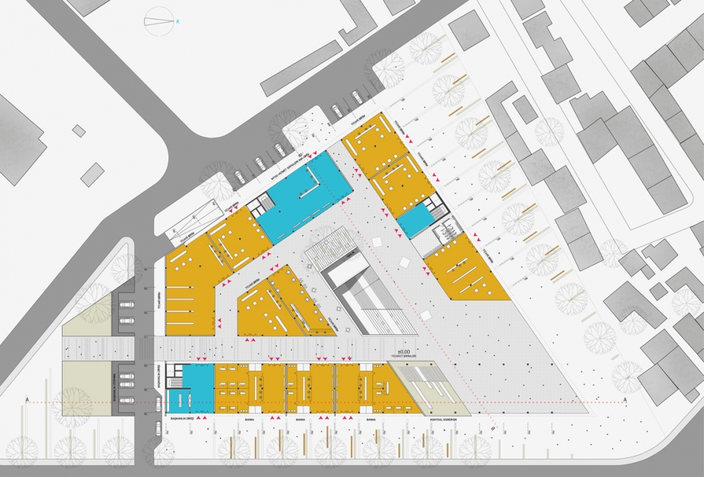 Due to the space between the intersections, our proposal has lead to pedestrian ways through the building. Climate and temperature data of city of Mersin has shaped the main idea behind the proposed design. As a base of the design, commercial and office spaces are separated with a horizontal volume.