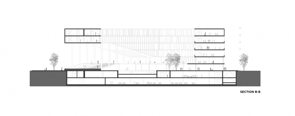 A social interface platform is introduced in-between the commercial and office spaces to generate a variety of activity spaces for the urban dwellers. Due to the hot and humid nature of the region, generating a natural air conditioning system by circulating air through this social interface is one of the important aspects of the design. On the ground floor the typology of the spaces is organized for the commercial needs to have more façades.