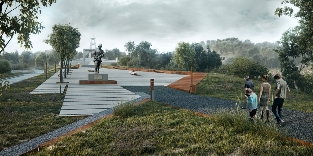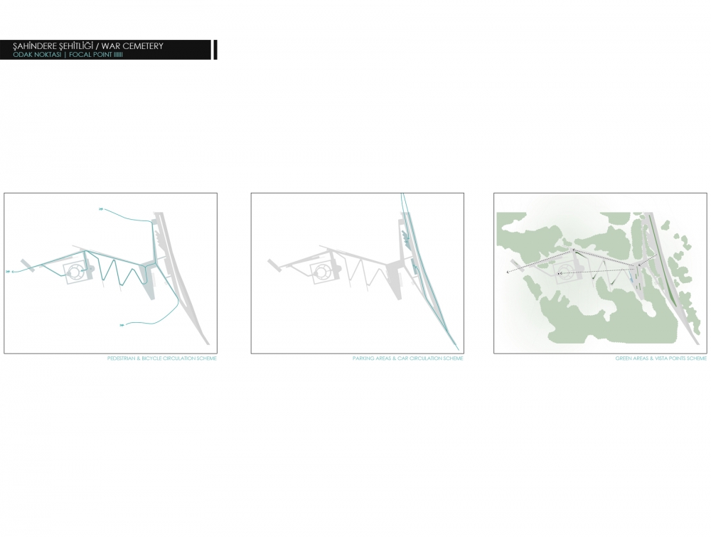 Tasarımda Gelibolu Yarımadası geneline özel hafifçe yere batık, kenarları paslandırılmış çelik (corten), yabani çiçek ve bitkiler ile diğer yönlendirici elemanların eşlik ettiği bir yol sistemi kurgulanmıştır. Batık yol ziyaretçilerin toprakla, doğayla daha yakın, birebir bir ilişki kurmalarını ve çevredeki diğer yolları ilerledikçe keşfedecekleri daha yoğun bir yürüme deneyimi sağlamaktadır. Yol kotunu düşürmek için çıkarılan toprak, yolun kenarlarına alınarak peyzaj yüzeyinde yumuşak bir çizik oluşturmaktadır. Savaşın ve dolayısıyla belleğin izlerini temsil eden, peyzaj üzerindeki bu çizgileri zaman içinde doğa, yine kendisi bitki örtüsüyle kapatacak, yarasını iyileştirecektir. Plandaki bu keskin çizgiler doğal malzeme kullanımı ve bitkilendirmeyle alanın içine girildiğinde sertliğini kaybedecek ve yere ait hissi yaratacaktır.