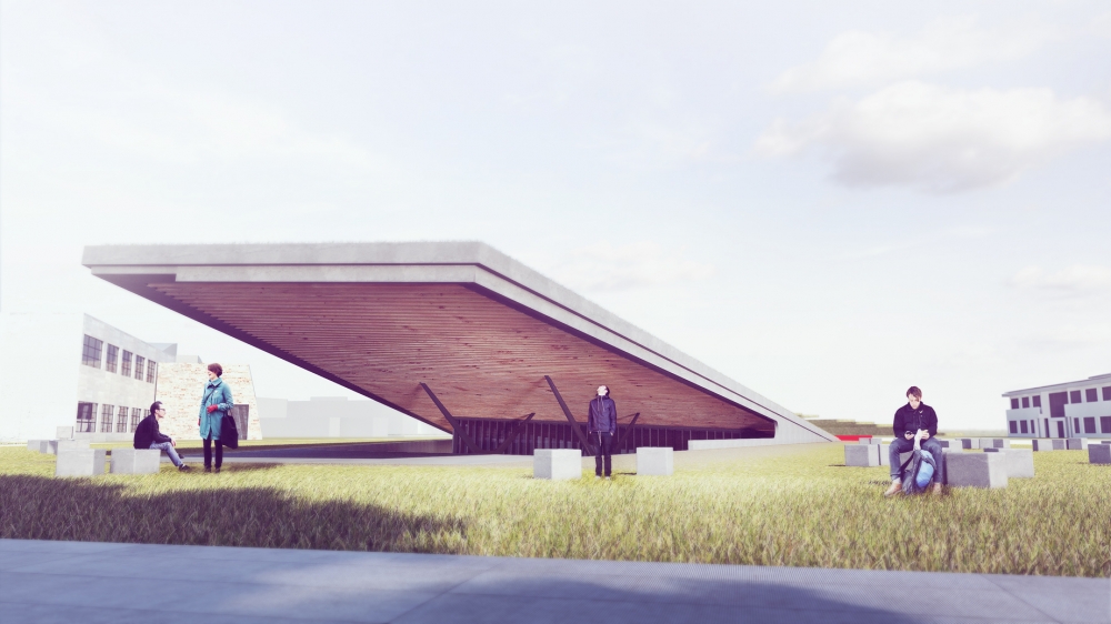 As a first step to achieve this goal, the vehicular traffic is taken outside of the site, leaving the middle space to pedestrians and green. The defining design element of the site is the V-shaped spine. This spine, open to bicycle and pedestrian circulation, connects the green spaces designed for the project. Originating from the main square defined by Silver and Silicon Blocks, the spine connects the performance space hosting also the kindergarten for the children of METUTECH employees, the hill generated by the leftover earth from the construction of METUTECH buildings with its amphitheater located within, and finally the artificial hill created on the axis leading to Science and Technology Museum respectively.