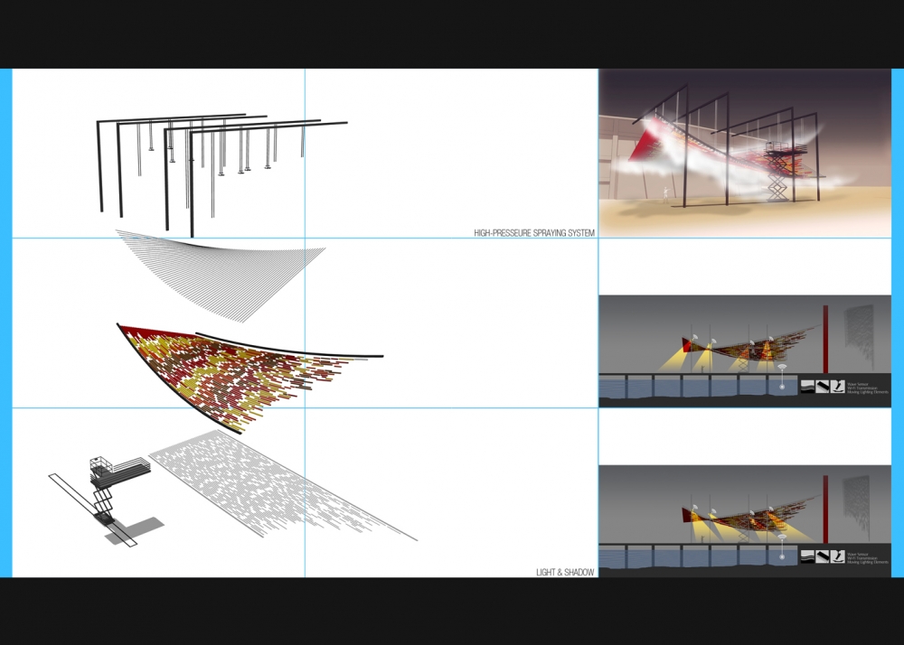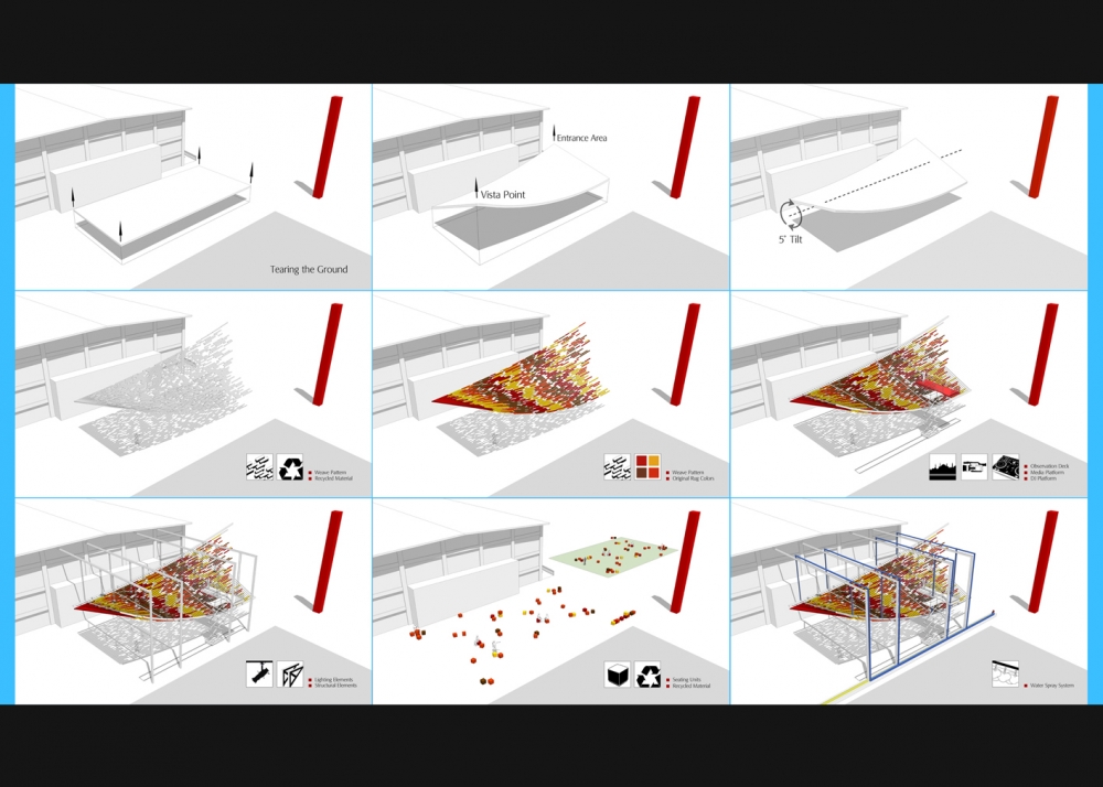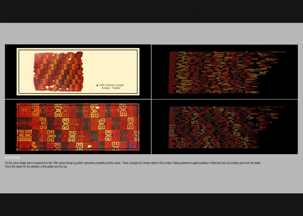 Tasarım ekibi, tam da bu noktada, yeri yırtıp yukarı kaldırarak bu sorunu gözler önüne seriyor. Halının altına süpürülmüş tüm bu atıklar, yerle birlikte havalanarak projenin ana parçalarını ve bütününü oluşturuyor. Bu bağlamda proje, denize atılan çöplerin ve kentin ürettiği atıkların bir yansıması haline geliyor ve bu konudaki duyarlılığın artırılmasını hedefliyor.